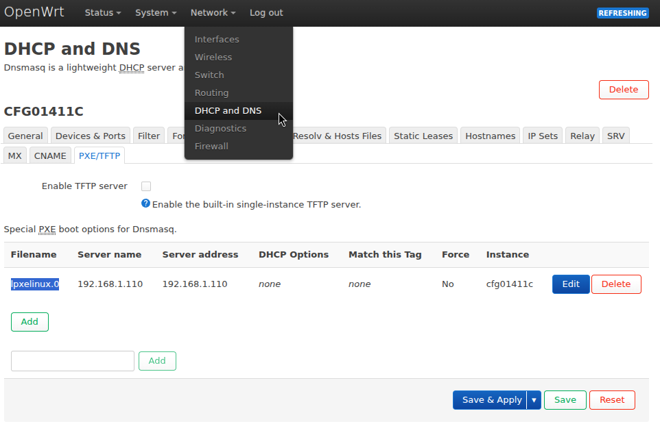 Nastavení lze přidat přes položku v menu Network -> DHCP and DNS. Pak úplně poslední záložka PXE/TFTP.