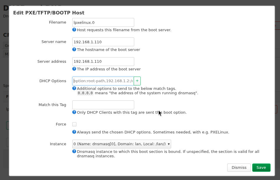 Náš čerstvě vytvořený virtuální stroj při PXE bootu jistě adresu dostane, ale také bude potřebovat od DHCP serveru vědět, kde najde prvotní soubor, který si má stáhnout.