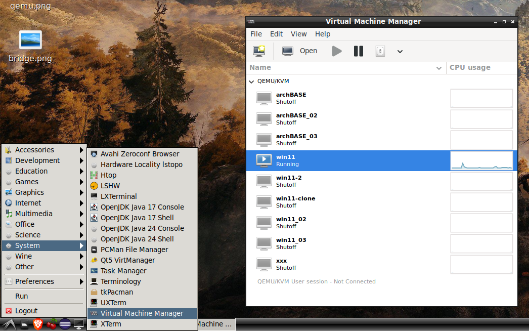 Základním grafickým nástrojem pro správu virtuálních strojů je Virtual Machine Manager. Tento nástroj najdeme v nabídce stran v záložce System grafického prostředí LXDE.
